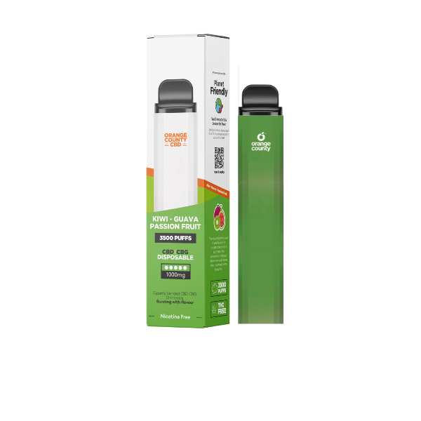 Upptäck vapen från Orange County CBD med uppfriskande Kiwi - Guava - Passion fruit-smak. Denna vape är förladdad med hela 10 ml e-vätska och innehåller en kraftfull kombination av 600 mg CBD och 400 mg CBG, helt fri från THC.