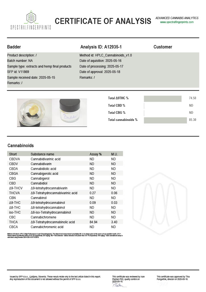 Upplev en ny nivå av cannabinoidprecision med vår THCA Badder, ett högkvalitativt extrakt med hela 85 % THCA, tillverkat i Europa enligt strikta laboratoriestandarder. Den mjuka, smidiga konsistensen gör den enkel att arbeta med – perfekt för teknisk eller samlande användning.